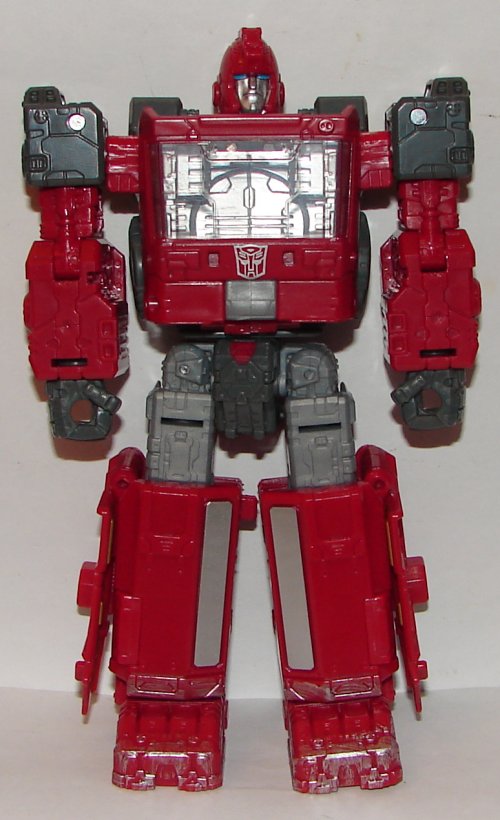 Robot Mode: I love the head sculpt and his gun is very cool. I would have preferred his shoulders be red, which would have made his roof and side panels red in vehicle mode.