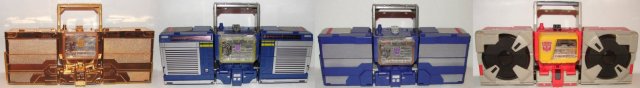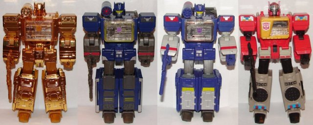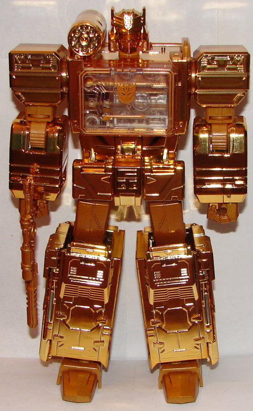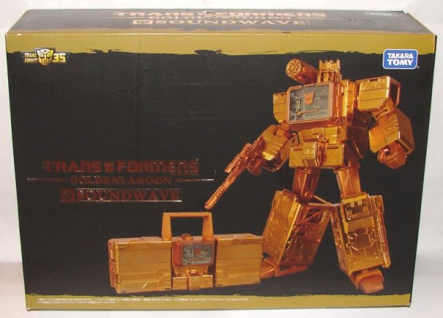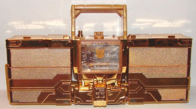 The Golden Lagoon Soundwave is repainted from the original Titans Return Soundwave mold and not the remolded Transformers Bumblebee version. Not sure exactly when this came out. It may have been before the Bumblebee remold came out. Anyway, he is very shiny, and looks amazing. What stinks though is that this is the paint job the G1 toy deserved for the Linkin Park Edition Soundwave.