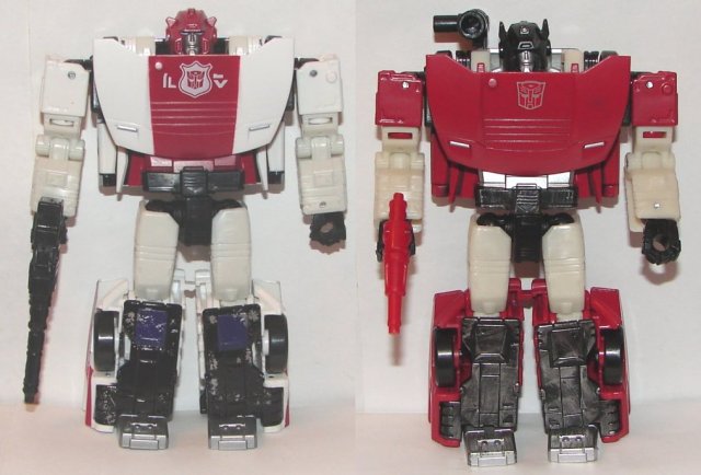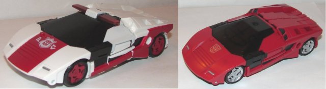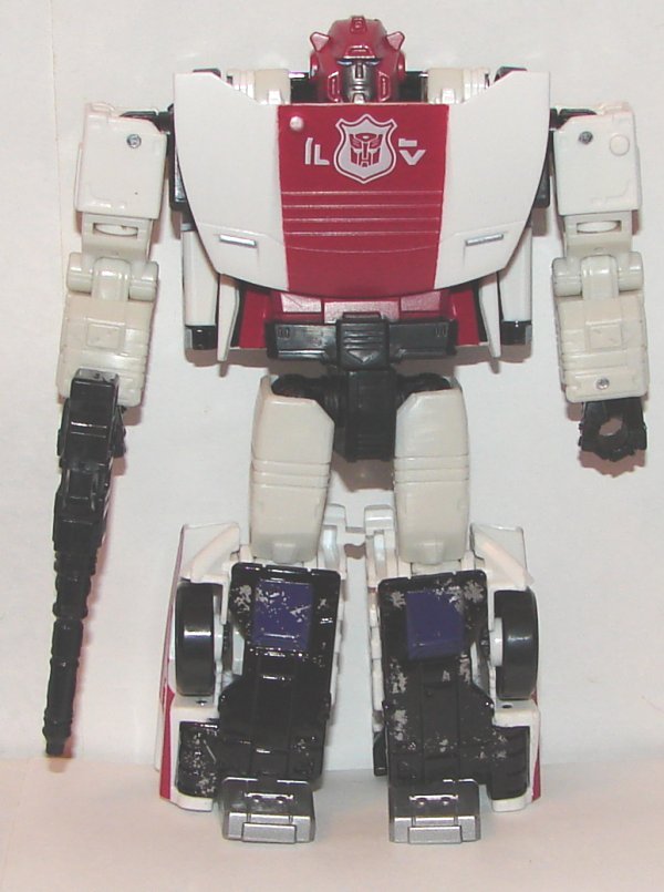 Wow, Sideswipe repainted as Red Alert, who would have thought? He has a great new head sculpt and a not so great new weapon. Red Alert’s new weapon does not double as a shoulder launcher like Sideswipe’s does. It also exposes Hasbro’s utter incompetence. Clearly both of these head sculpts and weapons were part of the mold. Instead of including both weapons with both Red Alert and Sideswipe, they only included one. What a fucking rip off. You have the parts in the mold to make both toys with accurate weapons, and they didn’t bother including them. Red Alert’s paintjob is great, except that he suffers from the same black plastic at each end of his windshield as Sideswipe. This looks even worse on Red Alert. It’s a real failure of design on an otherwise pretty good toy.
