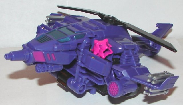 Chopper Cut looks okay, except that Megatron’s mace is sticking out the side. Megatron’s vehicle mode is crap. He looks fine in robot mode. I especially like his head sculpt. He has a great head sculpt when combined with Chopper Cut as well. He, like Bumblebee has two extra arms, but they are spring loaded, so you can’t do anything with them but let them hang there.
