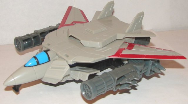 Sky Turbine looks awesome in jet mode. I love his cannons, but I wish he had a few more paint apps. Optimus Prime looks fine in vehicle mode, and pretty great in robot mode. When combined they look amazing. He has an awesome head sculpt and I love the guns on and over his shoulders. I’m sure someone intended the cannons on his shoulders to look like extra arms, but they don’t.