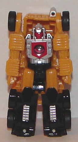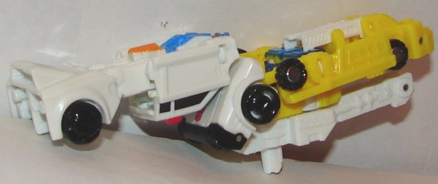 Wheel Blaze is repainted from Red Heat, who was remolded and repainted from Topshot. Wheel Blaze’s paint job and name are taken from Micromaster Combiner Metro Squad member Wheel Blaze. As a Combiner Squad members, Wheel Blaze was HALF of a vehicle mold. Apparently they somehow found a deeper bottom of the barrel to scrape. Wheel Blaze was all yellow, while is combiner team partner Roadburner was all white and had a lift bucket on it, so I guess they thought the ladder would make sense. They also really gave up on the paintjob. His head should be blue with a green face, but they painted his head all blue. I guess they figured that it was such a silly toy it wasn’t even worth painting correctly. I almost can’t blame them. Frankly, this is so half assed, I’, surprised they didn’t paint his from half yellow and his back half white and call him Wheel Burner. That would have at least been interesting.