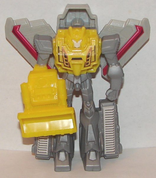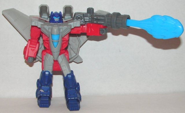 Oddly Starscream, unlike the others, comes with a sticker sheet with stickers that go on his chest, wings, and the treads on the sides of his legs. He looks okay, though I wish his arms wasn’t molded as part of his weapon.