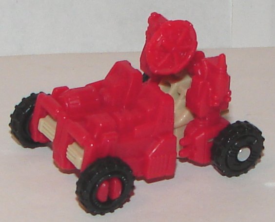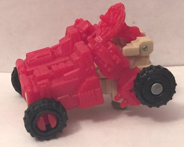 So, at first when I saw that he had a flip out handle in his chest, I assumed he turned into a gun, since Hasbro is incapable of making a Micromaster that does not also turn into a gun (after turning Targetmasters in Headmasters for absolutely not reason, it should not be surprising). However, that does not seem to be the case. Countdown sort of mistransforms into a thing that clips onto Omega Supreme’s shoulder. It clearly was not something they though about when designing him (or if they did, someone should be fired). His legs tip up, though they don’t lock in place, and since he has ball joints in his hips, they are hard to get lined up. There isn’t even a tab to hold his legs together. Then you tip his arms down, and again, with the ball joints in his shoulders, they don’t line up, and don’t snap in place. I really don’t understand the thinking here (assuming there was any). They would have been better off putting flip out gun barrels either on his lower legs or thighs and just making him a gun.