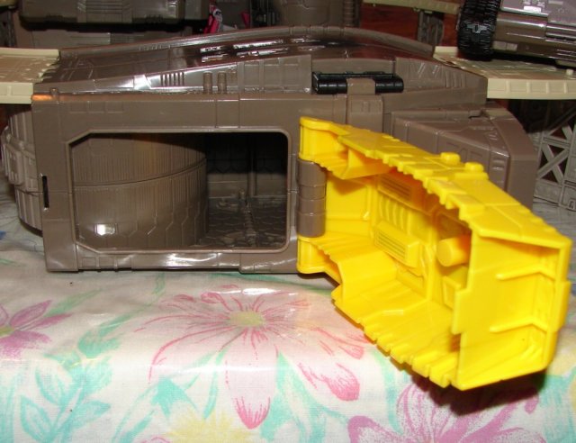 Rocket Base: Omega Supreme looks INCREDIBLE! There are two doors on one side of the top of the missile that open up so you can put in a Micromaster. Also, the yellow panels on his legs (not likely to lose those “clips” 🙂 open up to put in a Micromaster also. The only issue with Omega Supreme’s rocket base mode is that the track for the tanks is very shallow. If you push him around the track, he tends to jump off it. It’s also too wide. Neither of those issues really hurt the MAJESTIC SPLENDOR of Omega Supreme in Rocket Base mode.