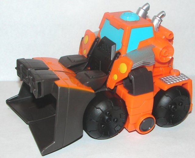 It’s unfortunate that Hasbro didn’t put a little more work into painting this toy. The mold is a pretty decent representation of Wedge, but he needed way more paint apps. Compare him to the animation. He needed the sides and fins on his head painted black. The molding is there, it’s just not painted. It’s unfortunate, because I really like the mold, the paintjob is just completely inadequate. He looks pretty great in vehicle mold. I could see a remold and repaint on this toy as Boulder down the road.