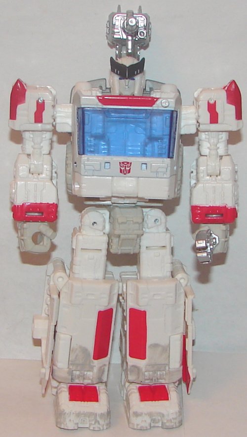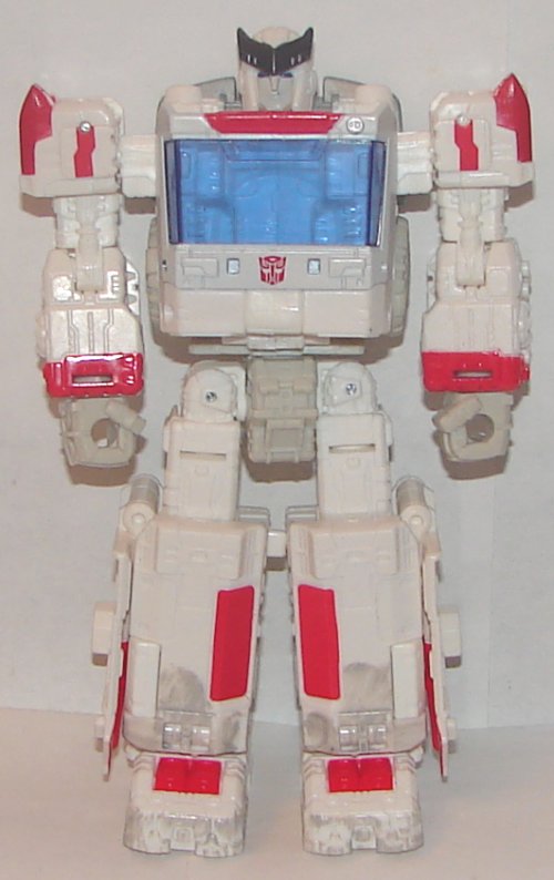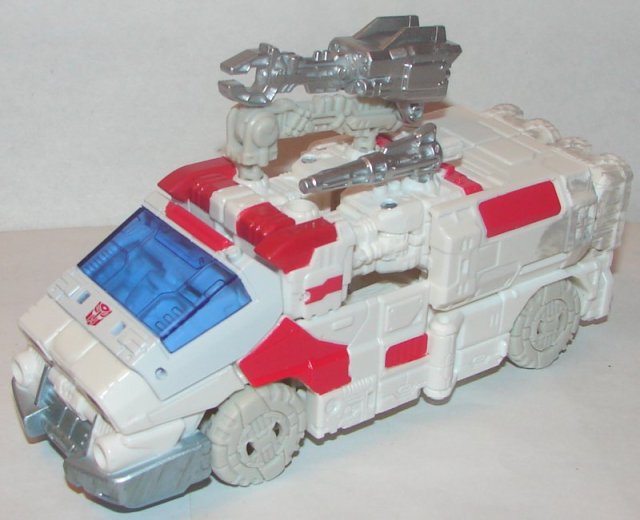 In addition to the new paintjob, Ratchet has a new head, a new front bumper, new shoulders, and new forearms. His head sculpt looks great, and his paint job is perfect. I love his blue window in ambulance mode. The only thing I don’t like is the white wheels. He would look much better with black wheels. I like the new accessories, but when the gun arm is folded up on Ratchet’s roof, there are ports for both pegs. The front peg is too long (or the front port is too shallow) so the second one can’t really plug in. The gun and arm should have been included with Ironhide. In one of the G1 episodes, I can’t recall which one, Ironhide actually used the gun on the arm connected to his back. Yet another example of Hasbro leaving out available accessories. Ratchet’s repair bay is not a dumpster fire. To call it a dumpster fire would be generous. It’s a dumpster full of shit that’s been doused with gasoline and nuked. It’s a waste to have even included it in the instructions.