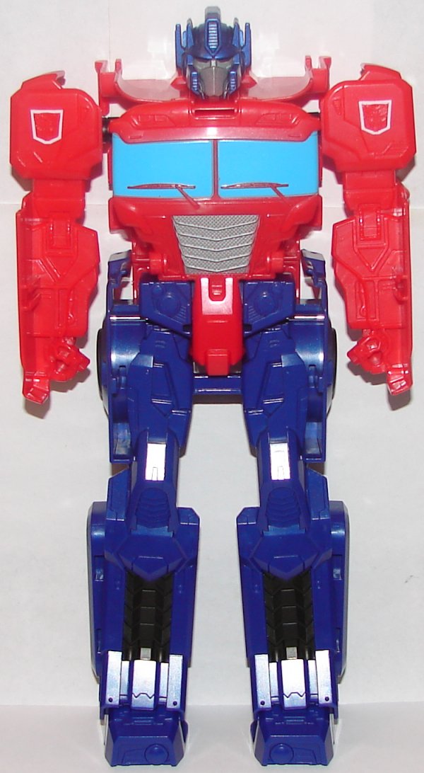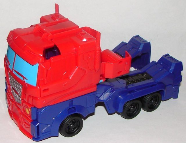 There is nothing grievously bad about Optimus Prime’s robot mode. In fact, I really like the head sculpt. I’d call him above average. His vehicle mode is not too bad. I’m not crazy about the blue panels on the side of the cab, but it doesn’t look that bad. He does had two holes in his roof. Also, this arms don’t fold up the way they should so they stick out the back and leave a big open void in the back of the cab.