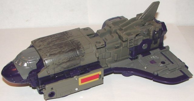 Space Shuttle Mode: In space shuttle mode, Astrotrain is a story in two parts. The first part being the front, which looks great, and the second part being the back, which sucks balls. The back half of the shuttle looks like it’s missing the outside. It looks ridiculous. If the ports for his weapons were further back on his roof, and closer to the fuselage on his wings, it *might* have made it a little less obvious. In this mod his tender can be used as a launch platform, or, I guess, a dock. He doesn’t tab into it, just lays on it. Both uses of the tender in this mode suck. It can’t unfold completely flat. The front section sticks up at an angle. Extremely poor design.