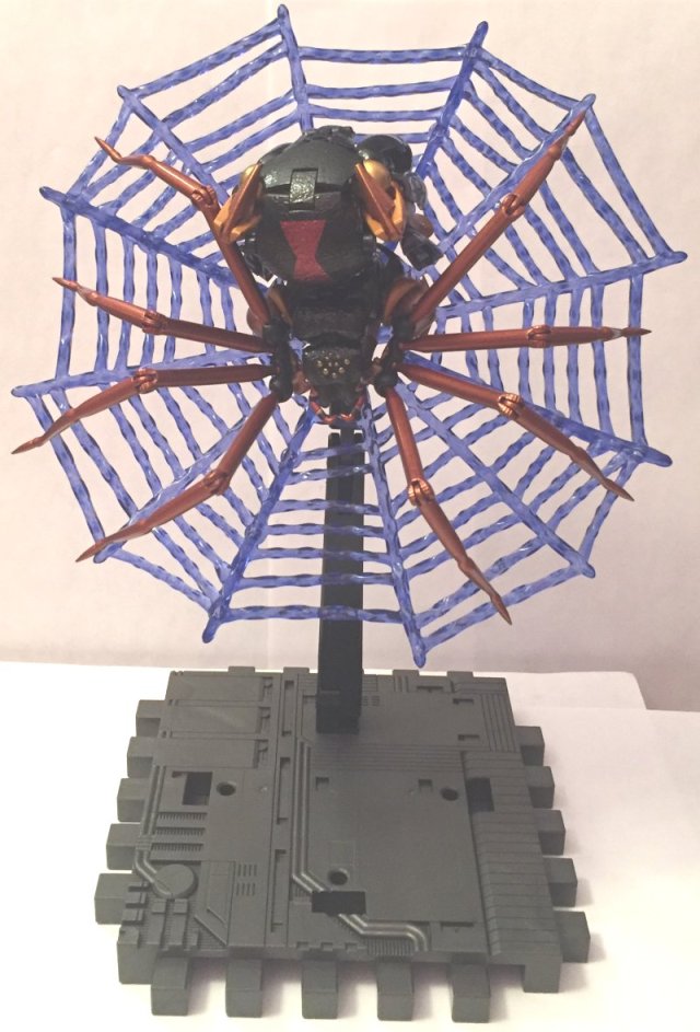 Beast Mode: Blackarachnia’s spider mode is…okay. Colors are perfect, and I like the spider face, but her robot parts are clearly visible on her abdomen, which is oddly shaped. It seems to stand upright. In the cartoon, it was more rounded and suck out back rather than up. Maybe this is how she stood in the cartoon, but it just looks odd to me. She comes with a stand and spider web. It’s not terribly well designed. Her gun plugs into the bottom of her beast mode on two thin shallow ports, and then that plugs into the connector in the middle of the web. She will stay on the web pretty well, but the two thin ports are pretty shallow, and it took me a few tries to get her on there. I then had to be very careful to hold her onto the web while I adjusted her legs.