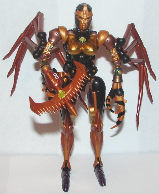 Robot Mode: The most important thing to note about Blackarachnia is that she is not that hard to transform to robot mode. Definitely the easiest transformation of any Masterpiece Beast Wars toys. The only issue I had was figuring out how to get her breasts and head into position, but once I figured out they can fit through the bracket that holds her back, the rest was easy. Now, I don’t know about transforming her back. I have no plans to do that anytime soon, if ever. In robot mode Blackarachnia looks perfect. Absolutely perfect. Her colors, prefect. Her head sculpt, perfect.