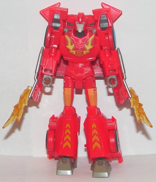 Robot Mode: Hot Rod looks pretty good in robot mode. He has pretty decent paint apps, accept for the red spoiler, and I love the head sculpt. Here again though you can see how silly the flames look on the outside of the pipes rather than coming from the end.