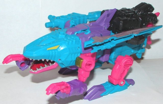 Robot Mode: Overbite has a great head sculpt, and his colors are perfect in robot mode. He has a sword that becomes part of Piranacon’s sword, and a gun. I wish his monster head folded down a little farther on his back.