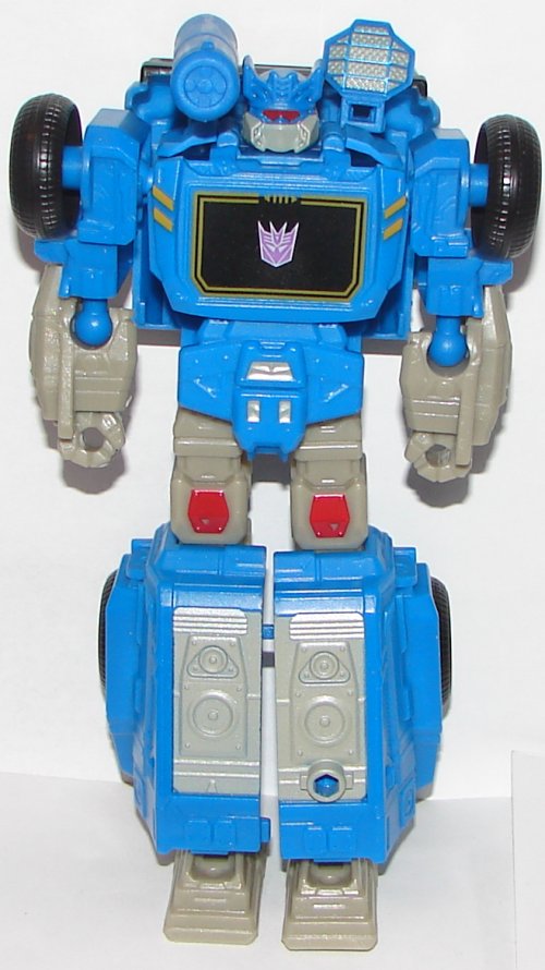 Robot Mode: In robot mode Soundwave looks pretty good. I like the head sculpt, which seems more like the G1 toy than the G1animation. Paint apps are fine. It would have been nice if he had a gun, but that’s probably asking for too much. The one thing that bugs me is the wheels on his shoulders. If those wheels could fold back and fill out his shoulders he would be a pretty spot on G1 Soundwave. Those wheels kind of ruin that a little, but they aren’t too bad.
