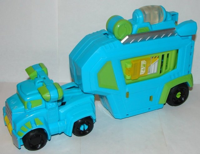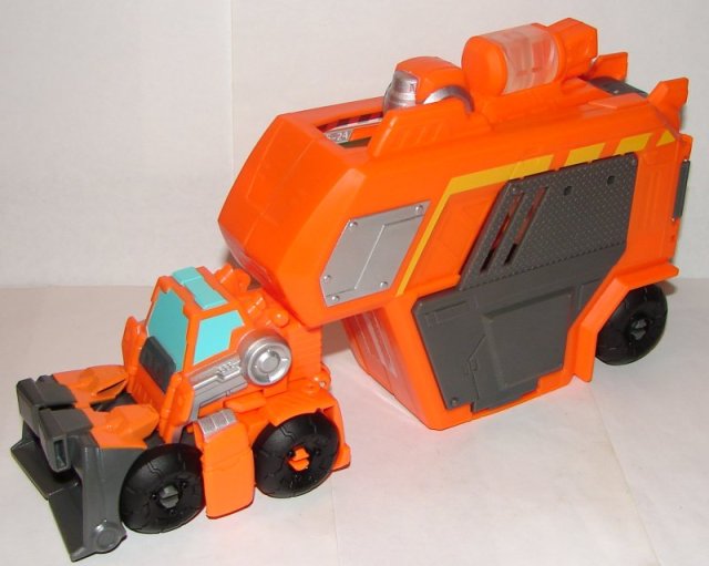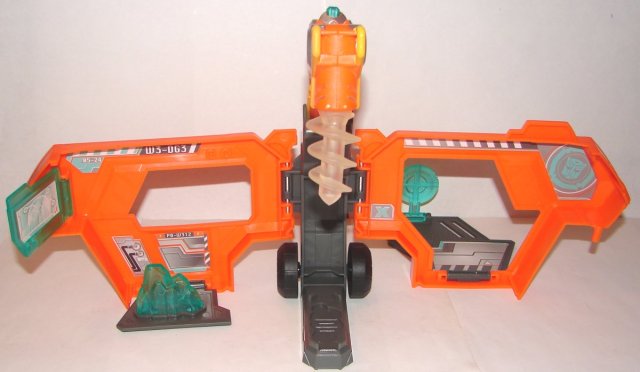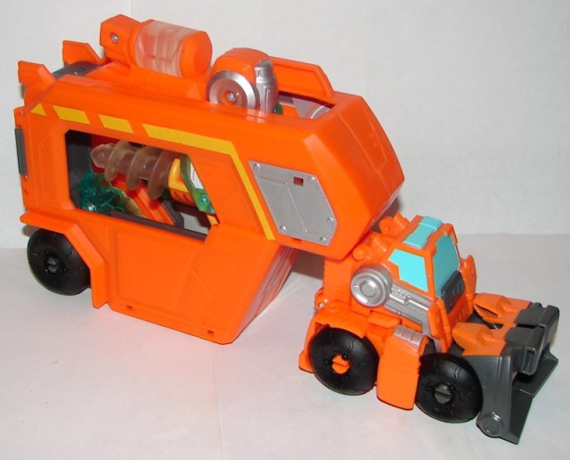 Hoist is a bulldozer, and his trailer is similarly uninteresting to Hoist’s. His includes a light up drill that can be mounted on his back in robot mode.
