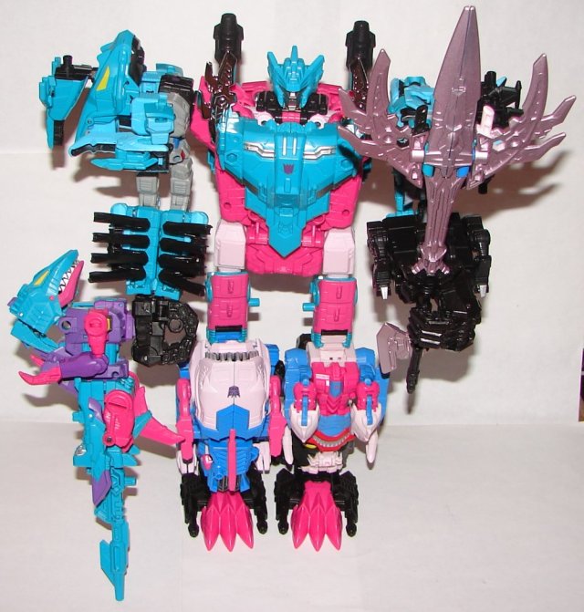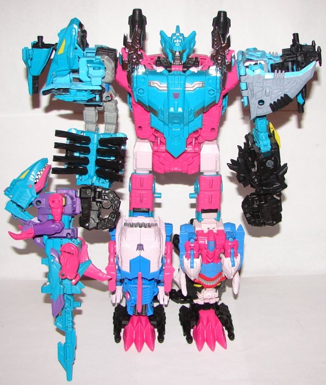 All hail the king! Piranacon (AKA King Poseidon) is long overdue. He is the last of the combiners we are going to get, since I have given up all hope of ever getting G2 Defensor or Monstructor. In a word, Piranacon is awesome! His sword is made of the swords and axes of the individual figured and looks great. His head sculpt is perfect. His colors are perfect. The wings on top of his chest shield are chrome just like they should be. Now, awesome as he is, there are a few things that are less than ideal, though none take away from his overall awesomeness. First off, while some of the individual figures guns incorporate into Piranacon, you do have a pile of them leftover. This is pretty unusual for Takara. Probably just another sign of them becoming more like Hasbro. I took Piranacon’s gun, which has lots of ports on it, and all the extras and put them together, but it doesn’t really look great. Feels like with a little thought this could have combined nicely. I guess as long as they all combine it doesn’t matter how. What they really needed to do was put more ports on the individual bots to accommodate all the extra weapons when combined. I am not crazy about how Overbite’s weapon mode is plugged into the back of Piranacon’s hand. I would prefer if he was able to hold him like a gun. That is probably asking for a lot given the weight of each toy. It’s a miracle he can stand up with him at all, though he can’t possibly hold his arm up. His arm joints just are not strong enough, and the barrel of the gun has to rest on the surface or he falls over. His upper legs and body are pretty thin. Would have been nice if he had a little more heft.