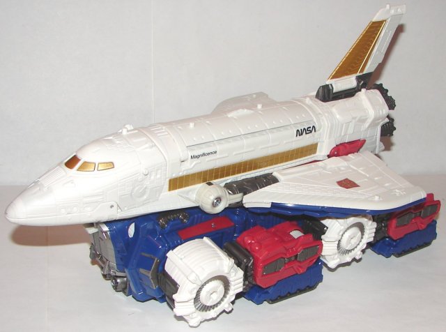 Individual Vehicle Modes: Before we get to the vehicle modes, I am so thrilled that this toy was officially licensed by NASA and carries the NASA logo. I kind of wish they had put the name ENTERPRISE on him for reasons I’m sure I don’t have to explain, but instead, they gave him the name Magnificence, which is such a perfect name for Sky Lynx. His space shuttle component is just about perfect. Paint apps are perfect. I wish the vertical stabilizer locked in place. It stays pretty well, but moves to either side. It just needed a notch and tab to give it a “center” position, but that’s not a huge thing. He has three blast effects that double as engine plumes. His launch platform has two gun accessories.