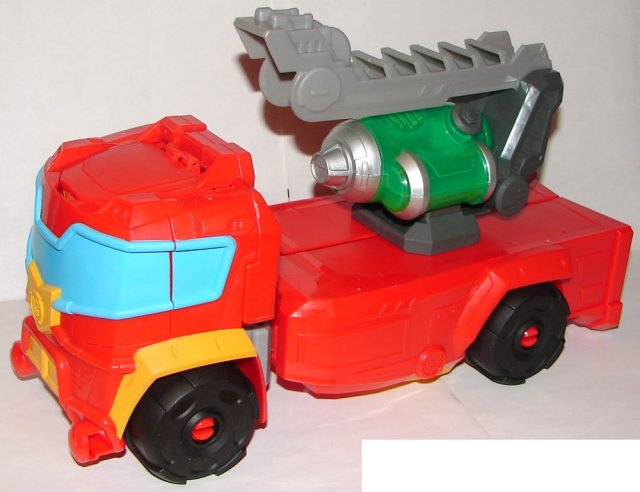Hasbro has so given up on the Rescue Bots line, that they didn’t even bother give this Hot Shot a fancy name like “Hook and Ladder Hot Shot”, “Giant and Out of Scale for No Reason Hot Shot”, or “Shameless Money Grab Before the Line Ends Hot Shot”. It’s just Rescue Bots Academy Hot Shot. No size class, no nothing, and that’s a pretty accurate description of this toy. It’s just not very good. At first I though I was an old Heatwave toy that had been remolded, but it isn’t. It’s new, which makes it even sadder that they couldn’t come up with anything better than this. In vehicle mode he’s a flatbed truck they are calling a fire truck with a big green and silver thing with lights and sounds mounted on the back. It has a ladder on top that is laughably short for the size of the vehicle. It has numerous sounds and the green plastic piece lights up. It mounts on his shoulder at a stupid angle, and cannot be moved.