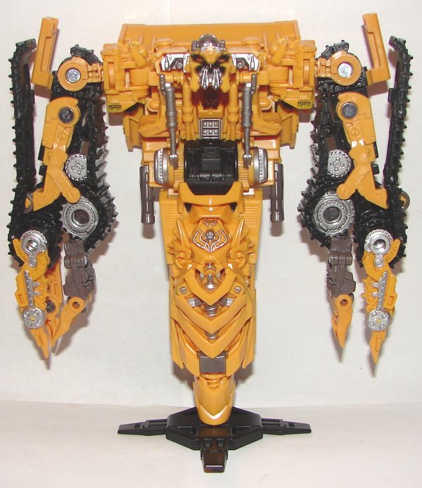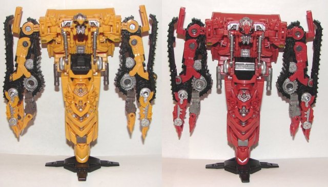 Devastator is combined from eight Constructicons (nine if you include Skipjack, AKA yellow Rampage). Read my reviews of Deluxe Class Hightower, Deluxe Class Scrapmetal, Voyager Class Long Haul, Voyager Class Mixmaster, Voyager Class Rampage, Voyager Class Scrapper, Voyager Class Skipjack, Leader Class Overload, Leader Class Scavenger, and Combiner Devastator.
