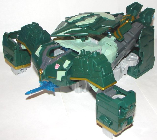 Vehicle Mode: Iaconus looks to have had his vehicle mode designed by the same people who gave us 2007 Movie Megatron who made a great robot mode and then folded it into something resembling some kind of vehicle. To make matters worse, he has an auto transform feature that makes it hard to transform him into vehicle mode, as he keeps wanting to transform until you get him locked. Also, when transforming him you have to press the lever and hold down on the back, or he’ll just pitch forward. The auto transform is also not complete, as you need to flip up the base on the back of his legs.