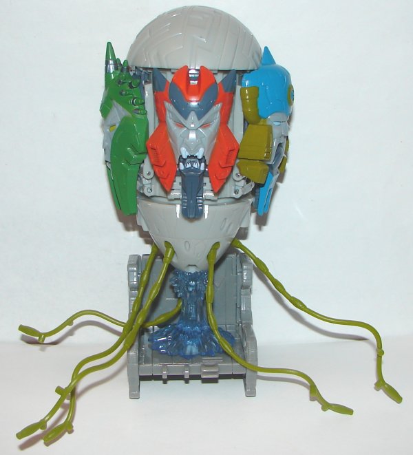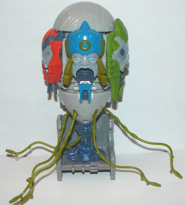 I still don’t have the retail version of this toy. Some of the color choices on this toy, the blue base and the green arms, are in the correct colors on the retail version. There are a lot of ways they could have repainted this without making it wrong, but it’s Hasbro, and we can only expect so much. The Quintesson Judge has no meaningful alternate mode. He transforms into a cell and something that vaguely sort of looks like part of a Quintesson ship. Hasbro would have been better off not making this toy transform, especially because its transformation creates a design flaw. The top of it’s body is not attached to it. It just sits on top with the cage connected beneath it. Hasbro has not yet figured out that sometimes Transformers don’t actually have to transform to be great toys. They would have been better off not making this Transform and packaging it in a Leader Class box with Allicon. The toy does look great if you ignore the wrong colors.