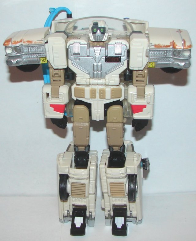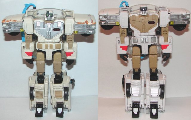 In vehicle mode, Ectotron is mostly unchanged. He has some rusty paint apps on his hood. They look fine, but if you’re going to give him rusty paint apps, maybe put them on the whole body of the car. His Ghostbusters logos also have lines in them so they appear cracked. In robot mode the paint changes are mostly color switches, brown for silver and vice versa. I prefer the silver chest on the new version. He has a new head sculpt. I was hoping for one without the goggles, but instead, it’s a different head sculpt with goggles. I think this one is better, but a regular head would have been nice on one of them.