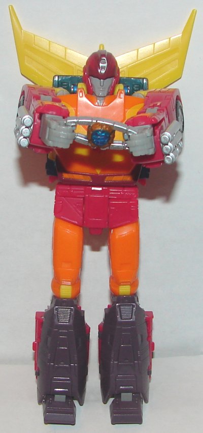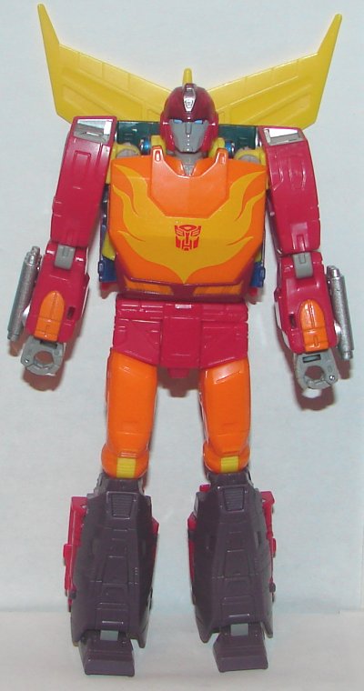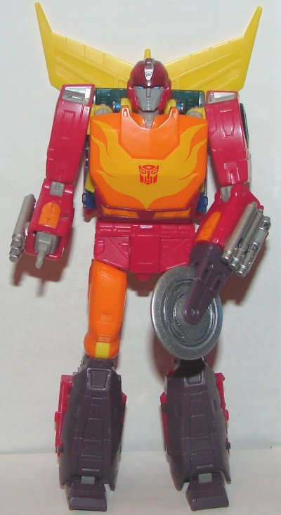 Robot Mode: In robot mode Hot Rod is awesome. His two guns don’t quite match his originals, but they do have similarities. One hand can be flipped into his arm revealing the tool he used to put Kup back together, on the other you can mount his saw blade. He comes with the matrix from Optimus Prime (not a new mold) as well as a blast effect to simulate it being opened.