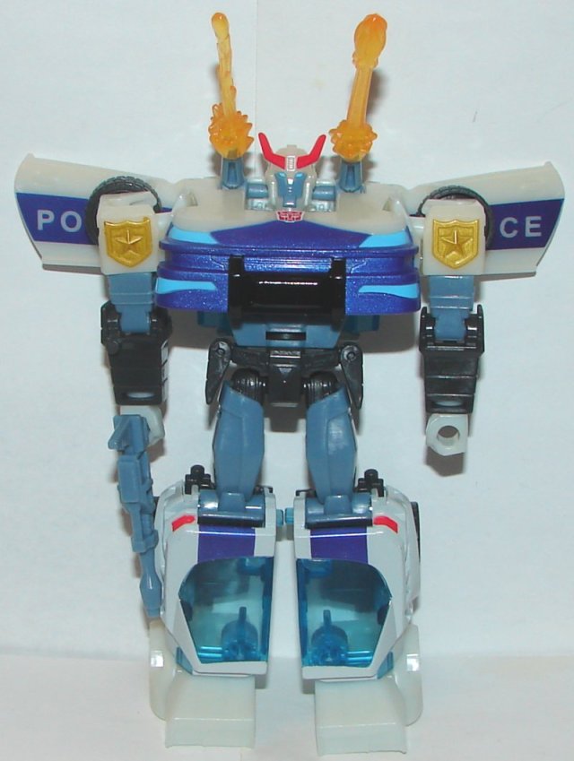 Robot Mode: Prowl looks great in robot mode, though I wish his shoulder guns were a little larger. They are just kind of small. I am not a fan of the blast effects, but giving him two that are different sizes is just stupid. Even though they are not full badges, I like that the design on his shoulders are at least shaped like a badge.