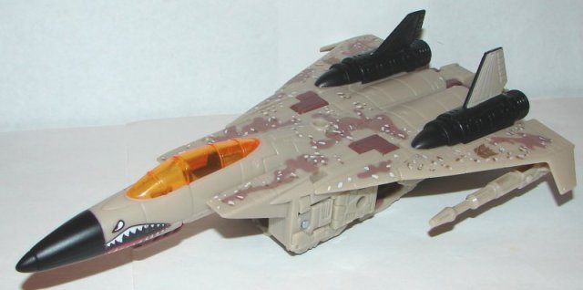 G2 Sandstorm is based on a planned, but ultimately unreleased repaint of G2 Ramjet. Art does exist. Points to Hasbro. I love it when they give us toys that never got released, even if they are in new molds. His desert camouflage looks great.