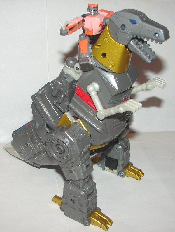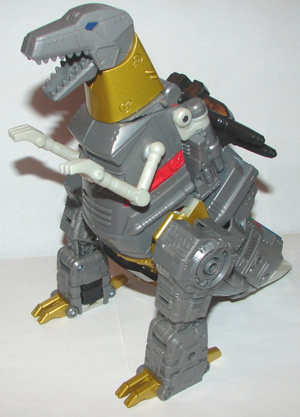 Dinosaur Mode: Before we get to Grimlock, we need to talk about Wheelie. I did not expect Wheelie would actually transform, but I was expecting that he could stand up on his own. Wheelie is nothing but an accessory. His legs are molded into a sitting position. He’s only good for sitting on Grimlock’s back in dinosaur mode or on his shoulder in robot mode. Pretty crappy that they couldn’t add two simple knee joints so he could stand on his own. As to Grimlock, he looks amazing. He is absolutely perfect.