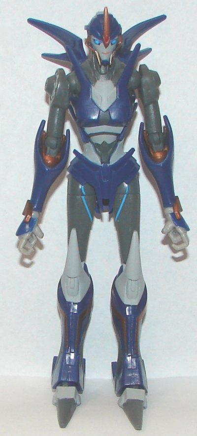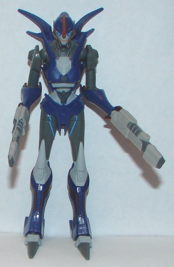 Arcee comes with two sets of hands, one fists, and the other that can hold guns, but oddly she does not come with guns she can hold. She has two blades that attached to her arms, and each has an attachment with spikes on them. The box shows the spikes being purple, so they are likely meant to be blast effects, but as they are just gray plastic, they are crap. She has two guns that can replace her hands. Its been a long time since I’ve watched Transformers: Prime, but I do recall both the blades and the guns from the series.