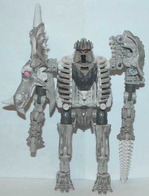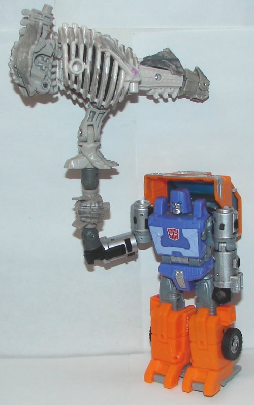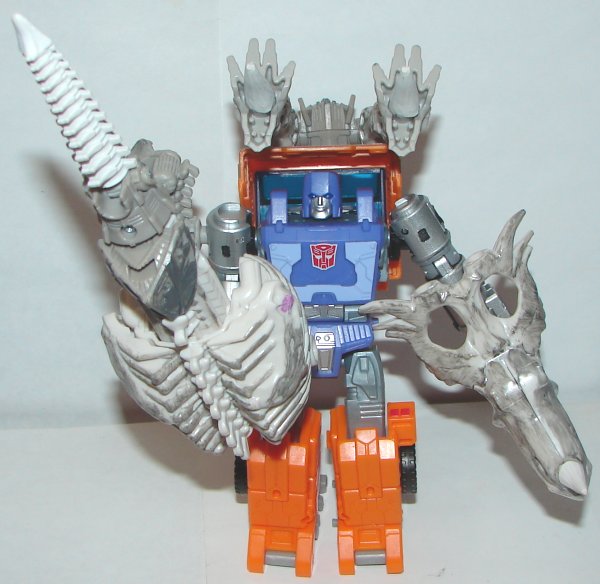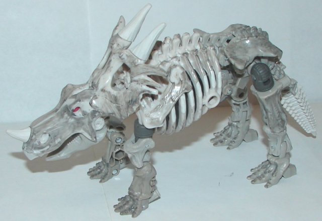 Beast Mode: Ractonite is a dinosaur skeleton. Yeah, I don’t get it either. I mean, I might get it if Hasbro bothered to put tech specs and character bios on the package so we can learn who the characters are. Absent of that, I don’t know if this toy is really great, or really stupid, but if we assume there is a logical and non-stupid reason he’s a skeletal dinosaur, then his dinosaur mode is pretty freaking awesome. I prefer Paleotrex’s color scheme. No real reason why one set of bones would be a different color than another, and a uniform look for the Fossilizers would have been awesome. Ignoring the color scheme, his paint apps are pretty great. Initially I thought he was a triceratops, but I think he is actually a styracosaurus.