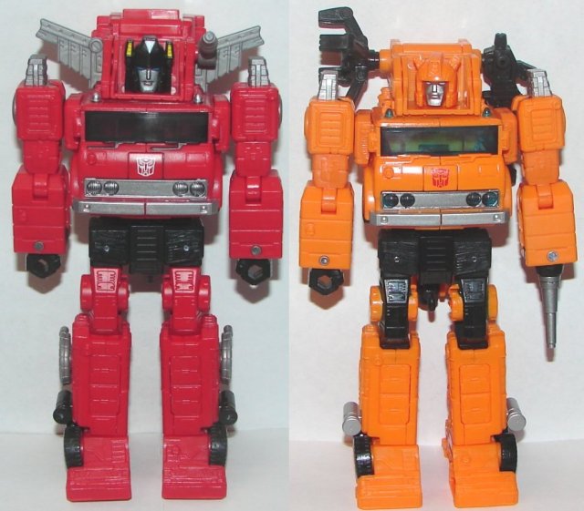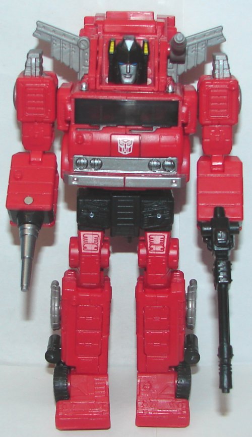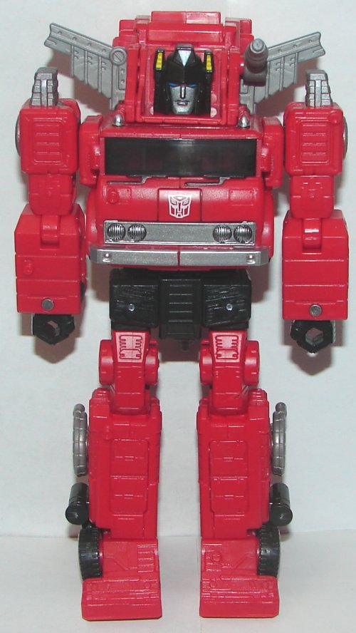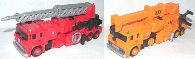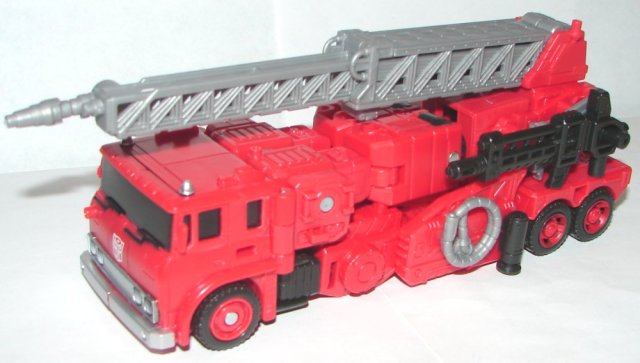 Inferno is awesome. From the neck down he is a repaint of Grapple, but he has been remolded from the neck up (including the ladder hanging off the back of his head). Obviously his head sculpt is new, and the sides of that brick that sits on his shoulders behind his head have been remolded to give Inferno the flip out wings and peg for his nozzle. While he could use a few more paint apps in vehicle mode, he’s not as plain looking as Grapple since his ladder is silver rather than the same color as the rest of him. Inferno has two coiled hose accessories that plug into ports on the sides of his legs. Those are new accessories, but no change was made to the mold.