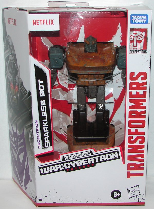 Sparkless Bot has a really great rusted paint job. However, we have no idea what he represents, or why an apparently dead bot is worth making a toy out of, since he has no tech specs.