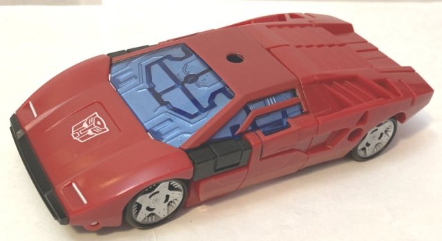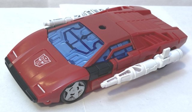 Oh my god, not again. Haven’t we seen this mold enough? It’s become like Covid, every time you think its gone, it changes and comes back. This is the tenth version of this mold, ninth if you don’t want to count Gigawatt since he’s nearly unrecognizable as a remold. Sideswipe has been remolded yet again so he more closely resembles a Lamborghini. He still has those black panels on the sides. Just once I’d like to see this toy painted correctly. He has a new missile accessory and the gun that came with Red Alert. Remnants of the circuit pattern in his Cybertron mode window are still present, which makes no sense for his earth mode.