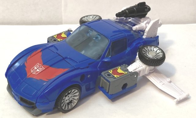 Car Mode: Tracks’ vehicle mode is show accurate. By that, I mean that Hasbro failed to properly paint the flames on Tracks hood as was done in the animation. While some will call that accurate, I call it pathetic. This is an instance where being too show accurate is a definite mistake. It ruins an otherwise near perfect vehicle mode. I say otherwise near perfect, because a little blue paint on the white showing on the rear of his trunk would have been nice. Probably too much to hope for.