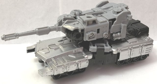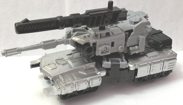 What my friend received was an up sized to roughly Voyager Class Thrilling Thirty Legends Class Megatron. It has die-cast metal parts, better plastic than most Hasbro releases, ratcheting joints, and a new more G1 head. The awesome paint job is based on the Takara release of Megatron. Other changes include filling in the big open gaps in his back and giving him more detail. Oddly, especially given how much better than the Hasbro version he is, they molded his arm/tank cannon upside down, leaving the gaps that should have been on the bottom of the cannon showing on top in tank mode. The black gun he comes with is an upsized version of the gun that came with Thrilling Thirty Legends Class Optimus Prime.