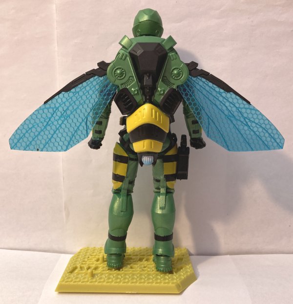 And here we have Wasp Raider. If we ignore that he should have something to do with Transformers for a moment, it’s a really cool looking figure. It’s got a lot of detail and a great paint job. He has wasp wings for some reason, which I don’t really get in a military figure, but whatever. He has two guns and a knife. I love the sheathe on the back of his belt for the knife, and the holster for his smaller gun. It’s a really detailed figure. (You’re probably sensing a “but” coming.)