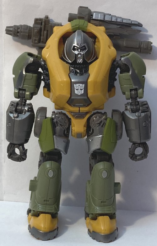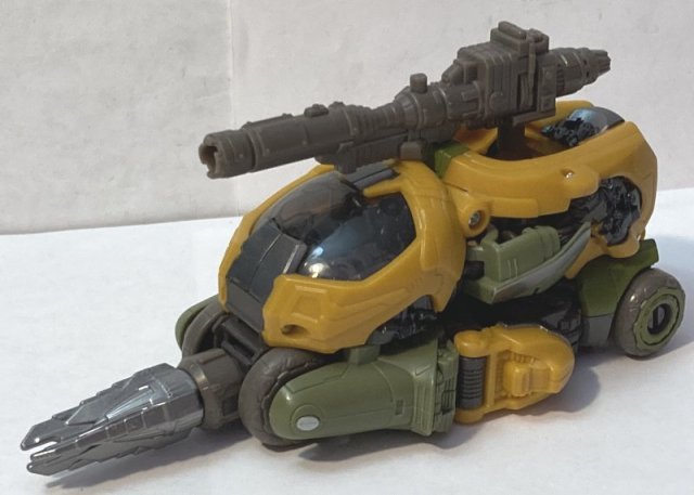 Vehicle Mode: I love Brawn’s vehicle mode. Seems like someone put more thought into it than other Cybertron alt modes. Brawn seems to be some kind of mining or tunneling vehicle with the drill on the front, and I can absolutely imagine Teletran-1 looking at a Suzuki Jimny SJ20 and thinking it the right choice for Brawn. His colors are perfect. Not sure why he has a big hole in the rear roof. His gun connects via a tiny port on the bottom of it and a tiny peg on his roof. It will fall off I you look at it funny. Really poor design. Otherwise his vehicle mode looks great.