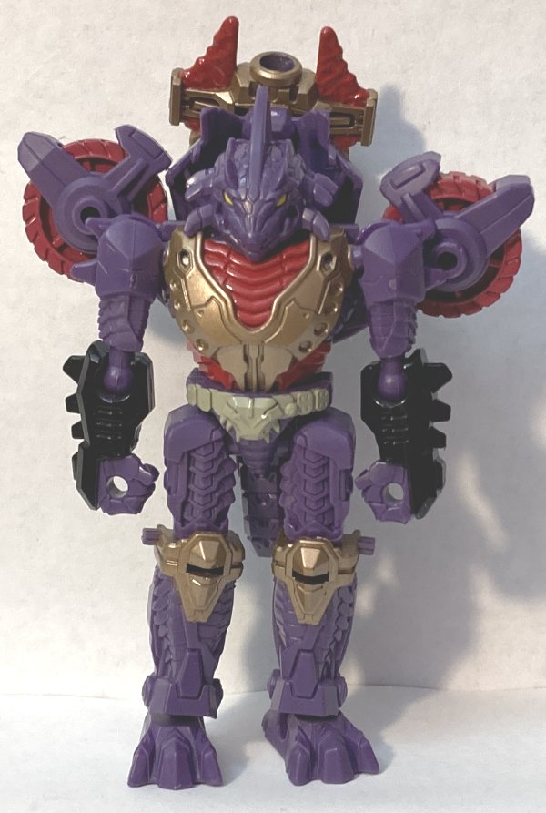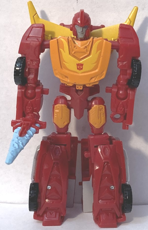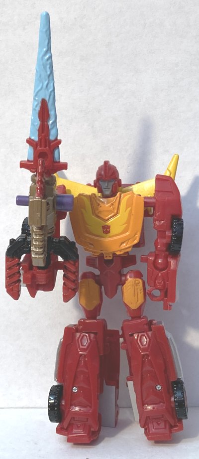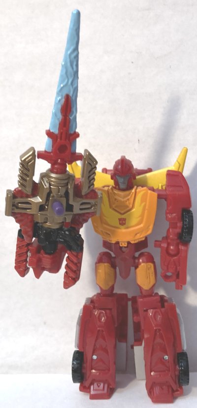 If you flip Iguanus’s weapon upside down, then they fit, but not really. The peg pushes against the gold bar on Iguanus’s weapon. It probably won’t do any terrible damage to it, but you’re forcing it in there and bending the plastic. Of course, on the other side, Hot Rod’s sword has to be turned 90 degrees, because it doesn’t fit. This configuration works, only barely, but it looks even more stupid. How did Hasbro screw this up? This is Trump Administration level incompetence, and made all the worse because up until now, legacy has been pretty darn great.