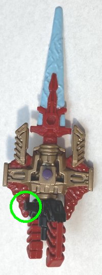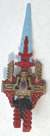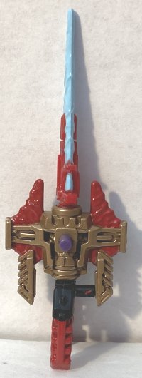 And now on to Hasbro’s stupid gimmick of the year. Combining weapons. Yippee. Let’s start with the idiocy of having two Decepticon weapons combine with an Autobot weapon. They have done this kind of crap before. This is just as stupid as combining Megatron with Slag. If we ignore the stupidity and look at the weapon we find that it even stupider, as it is not designed to properly combine. The instructions show the hilt (Skywarp’s weapon) of the sword attached to the end of Iguanus’s weapon with the red points. This is impossible since the peg on the side of Skywarp’s weapon is too long and it doesn’t fit. If you rotate the hilt slightly you can plug it in as shown, but the sword hilt should not be turned like that and it looks stupid.