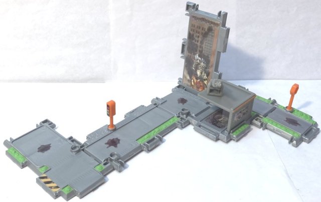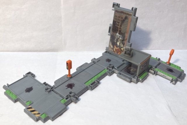 Nemesis Prime is a black Optimus Prime, surprise, surprise. His playset confuses me. The vertical piece with Megatron on it suggests a street from the battle at the end of the first movie, but the building has a gun on the roof. Also, for all some reason they didn’t do stickers for the stop sign and left it blank.