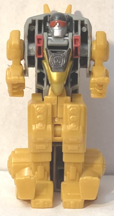 Sludge looks great. I love the gold. He has a button on his back, When you press it, his head bends down. In robot mode he looks okay, certainly better than Slag, but that’s not saying much.