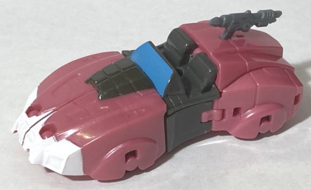 Vehicle Mode: Arcee’s vehicle mode look pretty good, but she’s a pain to transform. Her lower legs are connected at the end of a bar than needs to slide into her leg. It is difficult to do fully because the end of the bar has an off center ball joint to connect her lower leg. This makes it hard to push down on it without popping off her leg. Also, when you try to close up her hood the halves want to fold in. It’s just lousy design.