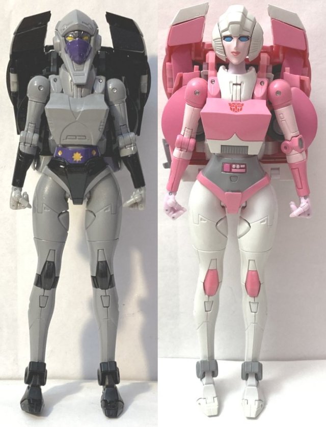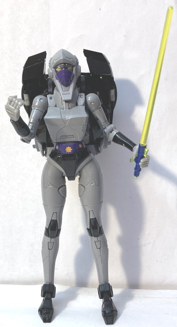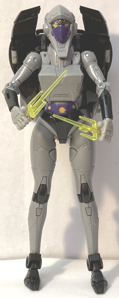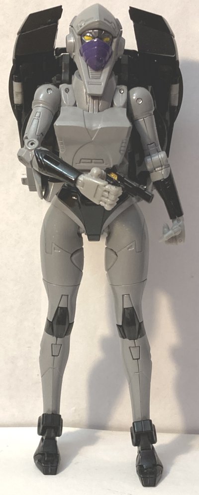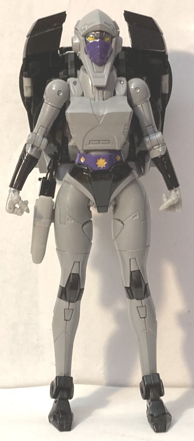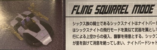 Masterpiece Nightbird is awesome! She is absolutely perfect. She has tons of weapons based on her appearance in the G1 cartoon, plus Arcee’s guns and holster, and two swords based on the ones that came with Legends Nightbird. For reasons I cannot understand her instructions show her with a “Flying Squirrel” mode. No idea where that comes from. It looks like the only parts that have been remolded from Arcee are her chest, waist, and head.