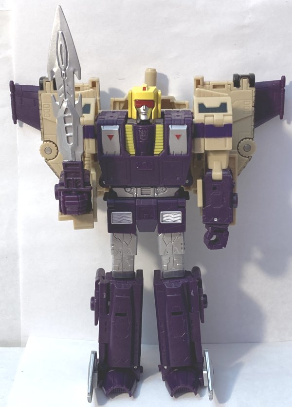 Robot Mode: Blitzing looks great in robot mode. He has two guns and a sword. The extra large fists are stupid and serve no purpose. They are part of Legacy’s weapon gimmick that I still don’t understand. Some toys have them, some don’t, it’s completely stupid. However, at least they did give him his correct weapons. It’s a pity Legacy Skywarp did not receive the same treatment.
