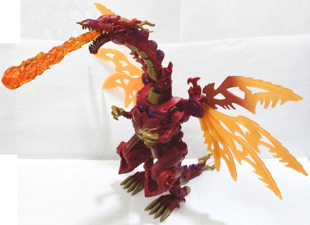 Beast Mode: I have a love hate relationship with Megatron. In Beast mode he looks pretty good, but his chest plate does not quite close all the way. I really love the wings, but I find his bent up legs hard to get into the same exact position so he stands up straight. He has a great head sculpt, but his neck seems a bit thin. His colors are great, and I love that his wings are frosted orange rather than translucent, but the way his claws are bent up and pointed inward looks weird. More good than bad on the average, I guess, but he’s far from a home run.