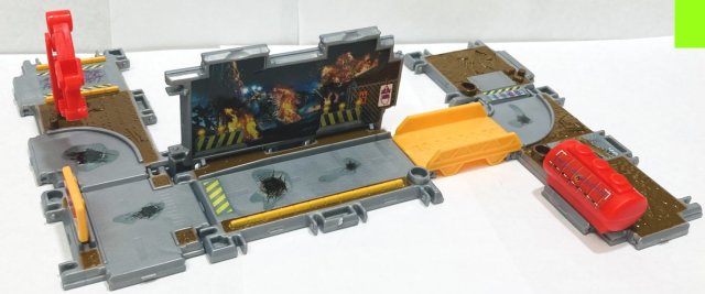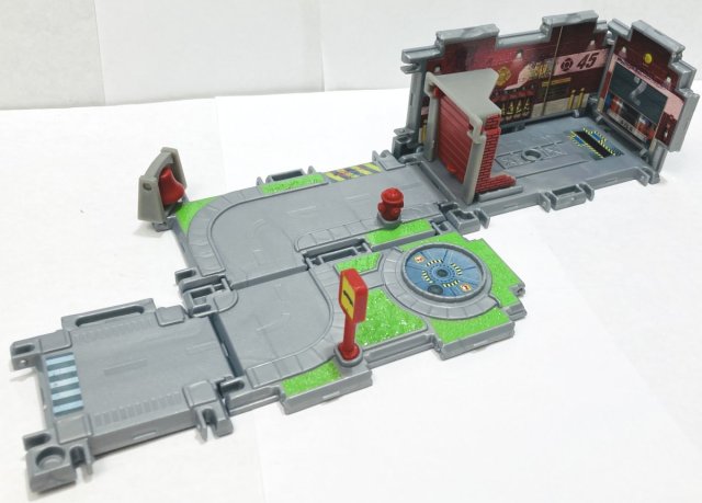 Each playset is made up of four rectangular and two square interlocking panels that form a box with the parts and vehicle inside. The panels differ from set to set. Pretty brilliant engineering, though popping them apart seems to put a lot of strain on very thin tabs, and I worry that with a lot of use they may break. I would frankly rather have had a six pack of the vehicles and no playsets at all. On a positive note, the stickers are very high quality and seem to stay in place.
