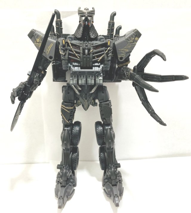 Robot Mode: In robot mode Scourge is a masterpiece. I love his big claw, and his sword is attached on a bar to his arm and flips up into his hand, you can’t completely remove it, only fold it back behind his arm. His claw arm is removable and he has a cannon attachment. They painted the chains wrapped around his grill, which looks fantastic. In robot mode he maybe could have used a bit more color.
