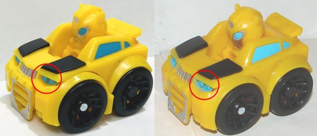 If you look at Bumblebee’s headlights you can see the original version’s paint seems to be less carefully applied. The blue paint extends down below the headlight.